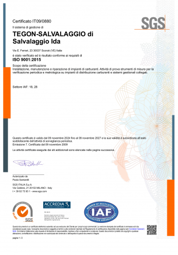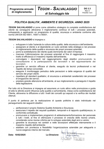 L’obiettivo principale della TEGON-SALVALAGGIO è quello di offrire un servizio completo, all’avanguardia e di qualità, sostenendo investimenti in nuove attività produttive, attrezzature, dispositivi per la sicurezza, qualificazione del personale e certificazioni: con l’intento di perseguire al meglio questo obiettivo, l’impresa è certificata ISO – 9001:2015 e OHSAS 18001:2007.