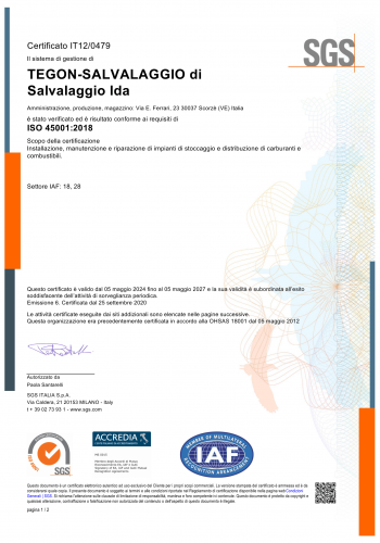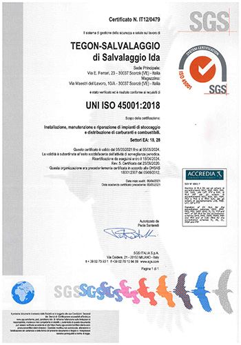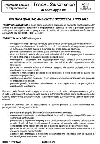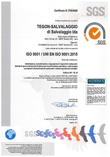 L’obiettivo principale della TEGON-SALVALAGGIO è quello di offrire un servizio completo, all’avanguardia e di qualità, sostenendo investimenti in nuove attività produttive, attrezzature, dispositivi per la sicurezza, qualificazione del personale e certificazioni: con l’intento di perseguire al meglio questo obiettivo, l’impresa è certificata ISO – 9001:2015 e OHSAS 18001:2007.